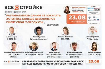 «Разрабатывать самим vs покупать. Зачем все больше девелоперов пилят свои it-продукты» - так звучала тема прямого эфира, прошедшего 23 августа на ютуб-канале «ВСЁ О СТРОЙКЕ». Эфир провела бессменная ведущая - директор проекта Светлана Опрышко при поддержке Минстроя России, Национального объединения строителей (НОСТРОЙ) и ПроГород (Группа ВЭБ.РФ).