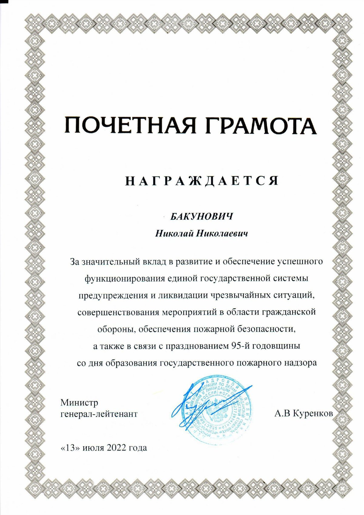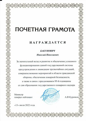 Как указано в приказе, Н.Н. Бакунович награжден за значительный вклад в развитие и обеспечение успешного функционирования единой государственной системы предупреждения и ликвидации чрезвычайных ситуаций, совершенствования мероприятий в области гражданской обороны, обеспечения пожарной безопасности, а также в связи с празднованием 95-й годовщины со дня образования государственного пожарного надзора.