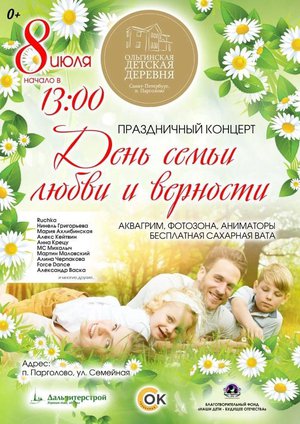 8 июля 2023 года Ольгинская детская деревня будет отмечать День семьи, любви и верности. В программу входит: праздничный концерт, конкурсы и подарки.