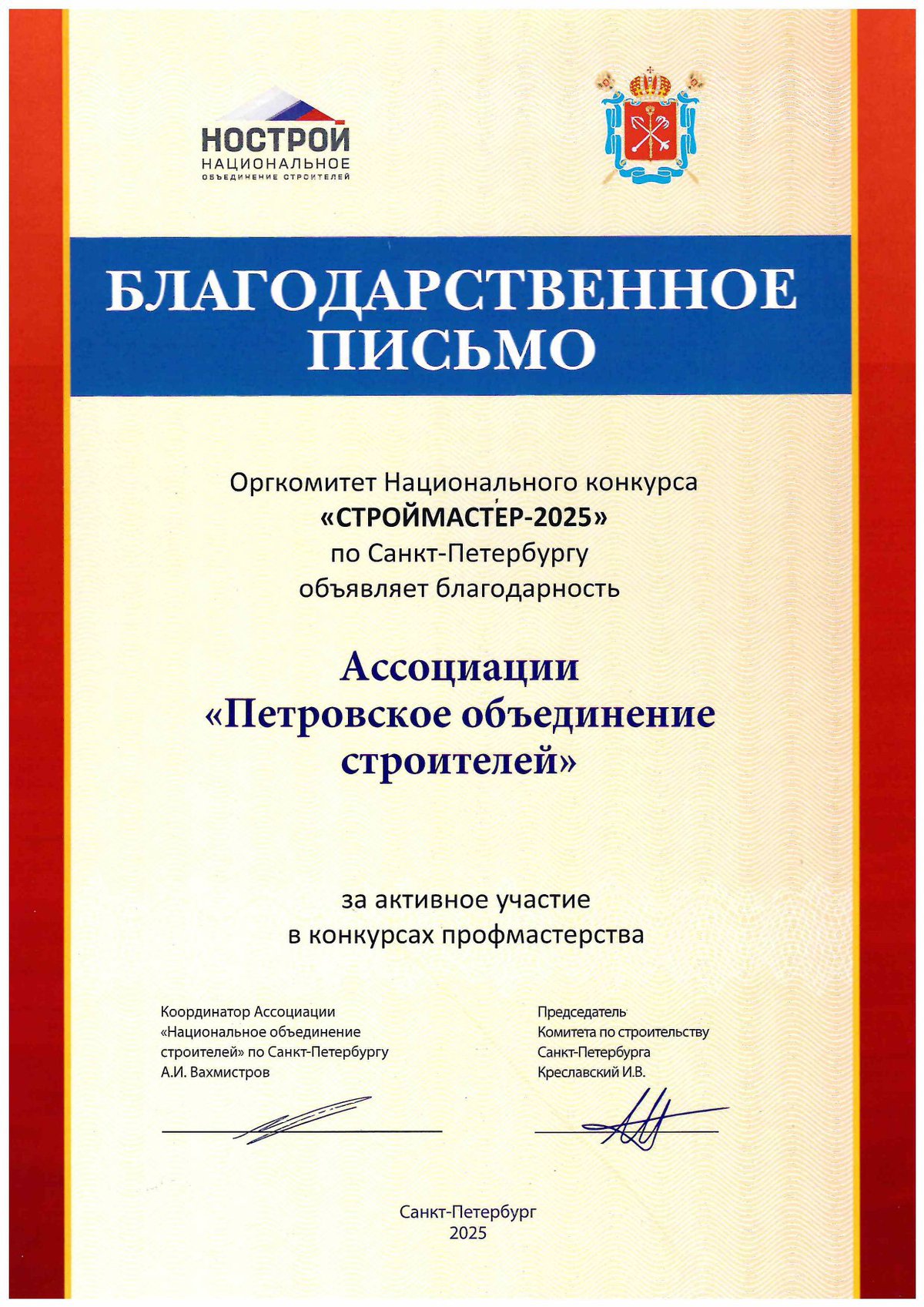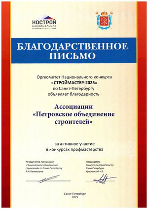 В 2025 году конкурсное движение привлекло к участию 200 профессионалов, которые показали свое мастерство в различных строительных специальностях. Награды получили 80 специалистов и руководителей организаций в номинациях «Лучшая бригада», «Лучший по профессии», «Лучшая СРО по работе с рабочими кадрами», «Лучшее предприятие стройиндустрии», «Лучший руководитель строительной компании, внесший личный вклад в повышение престижа рабочей профессии», «Ветеран строительной отрасли Санкт-Петербурга», «Лучшее учебное заведение по подготовке рабочих кадров», «Лучшее СМИ, освещающее вопросы профобразования», «Лучшая социально- ответственная компания».