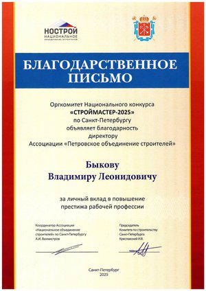 Всего в 13 номинациях были награждены 80 человек, среди которых представители строительных компаний, учебных заведений и объединений. Ассоциация «Петровское объединение строителей» была отмечена грамотой за активное участие в конкурсах профмастерства, а директор Ассоциации «ПОС» Владимир Быков награжден благодарственным письмом за личный вклад в повышение престижа рабочих профессий.
